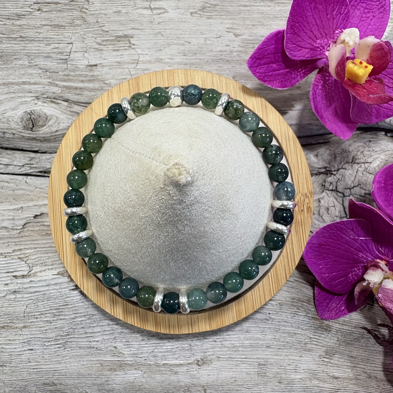 Ce bracelet Agate Mousse naturelle se porte seul ou accompagné d’autres bracelets, il habillera votre poignet par la beauté de ses nuances de vert. Fabriqué dans mon atelier, j’ai apporté le plus grand soin dans la sélection de ces pierres de 6mm de diamètre et de Grade AAA et de 6mm. J’ai associé ces pierres à des rondelles et perle intermédiaires en argent 925.