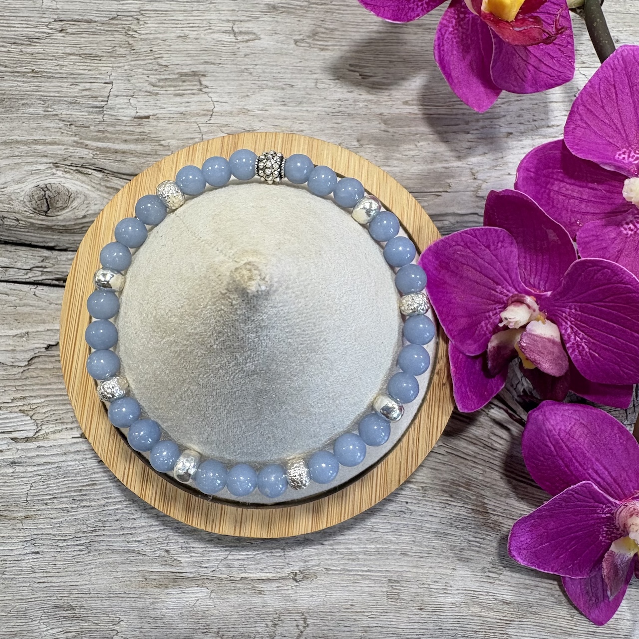 Ce précieux bracelet Angélite de grade AAA et de perles en argent 925, ravira les adeptes de pièces aux couleurs douces et tendres. En provenance du Brésil, cette pierre devenue l’emblème de l’âme pure, génère, à son contact, une impression de paix et de sérénité.