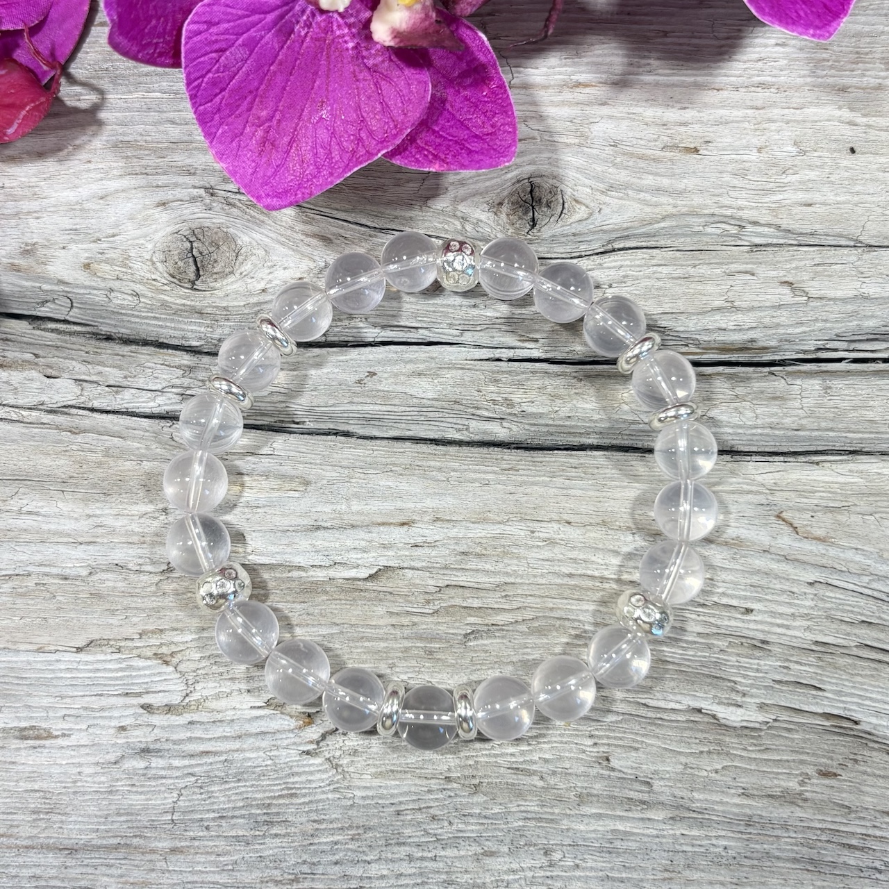 Luxueux bracelet de Cristal de Roche de grade AAA+ et de perles en argent massif 925. Les perles de ce bracelet sont d’une grande pureté sans aucune impureté ou inclusion. Fabriqué dans mon atelier j’ai apporté le plus grand soin dans la sélection de ces pierres de grade 3A+ en provenance de Madagascar qui sauront vous séduire par leur beauté. Ce bracelet peut être porté seul ou en association avec un autre bracelet, car il renforcera les propriétés des pierres de ce dernier.