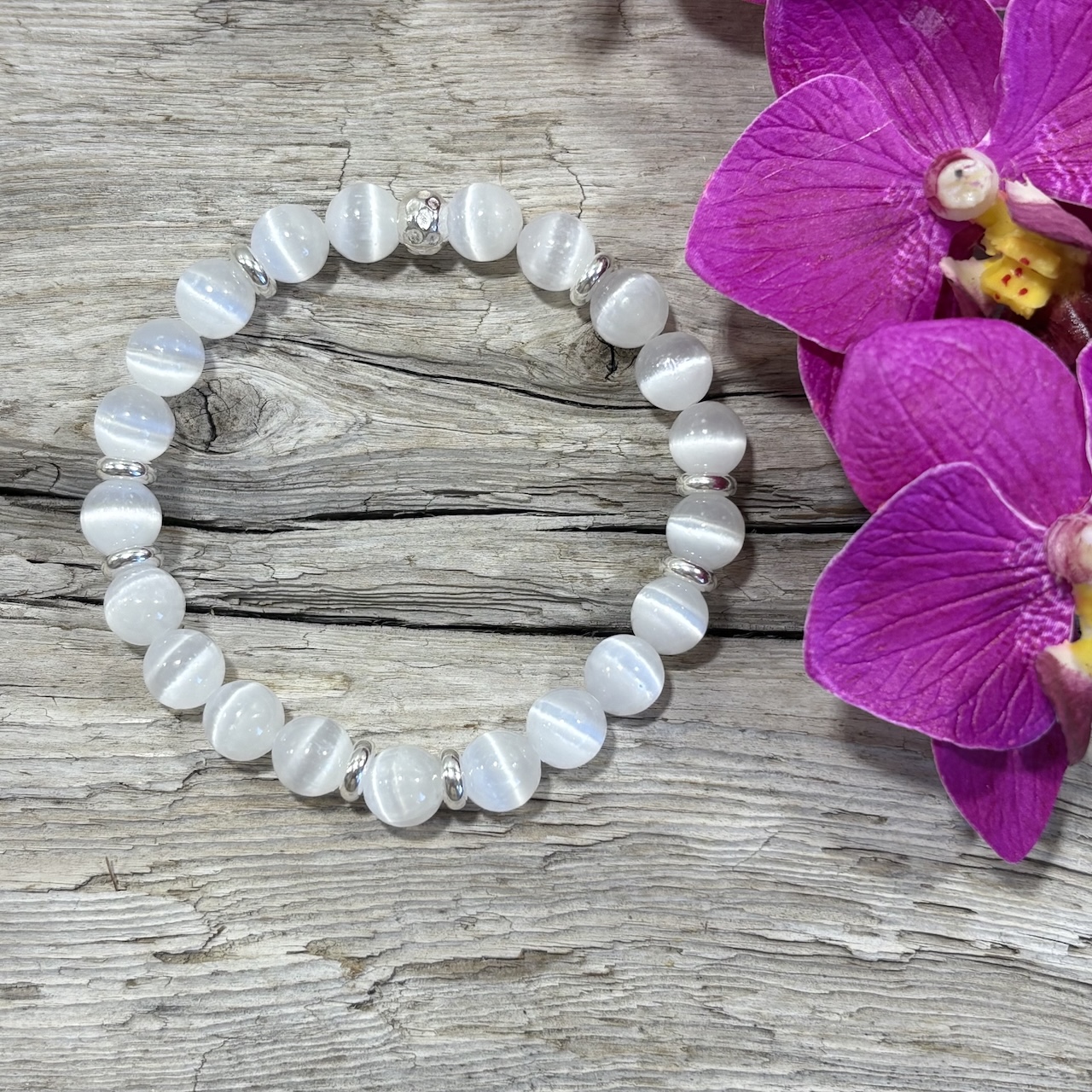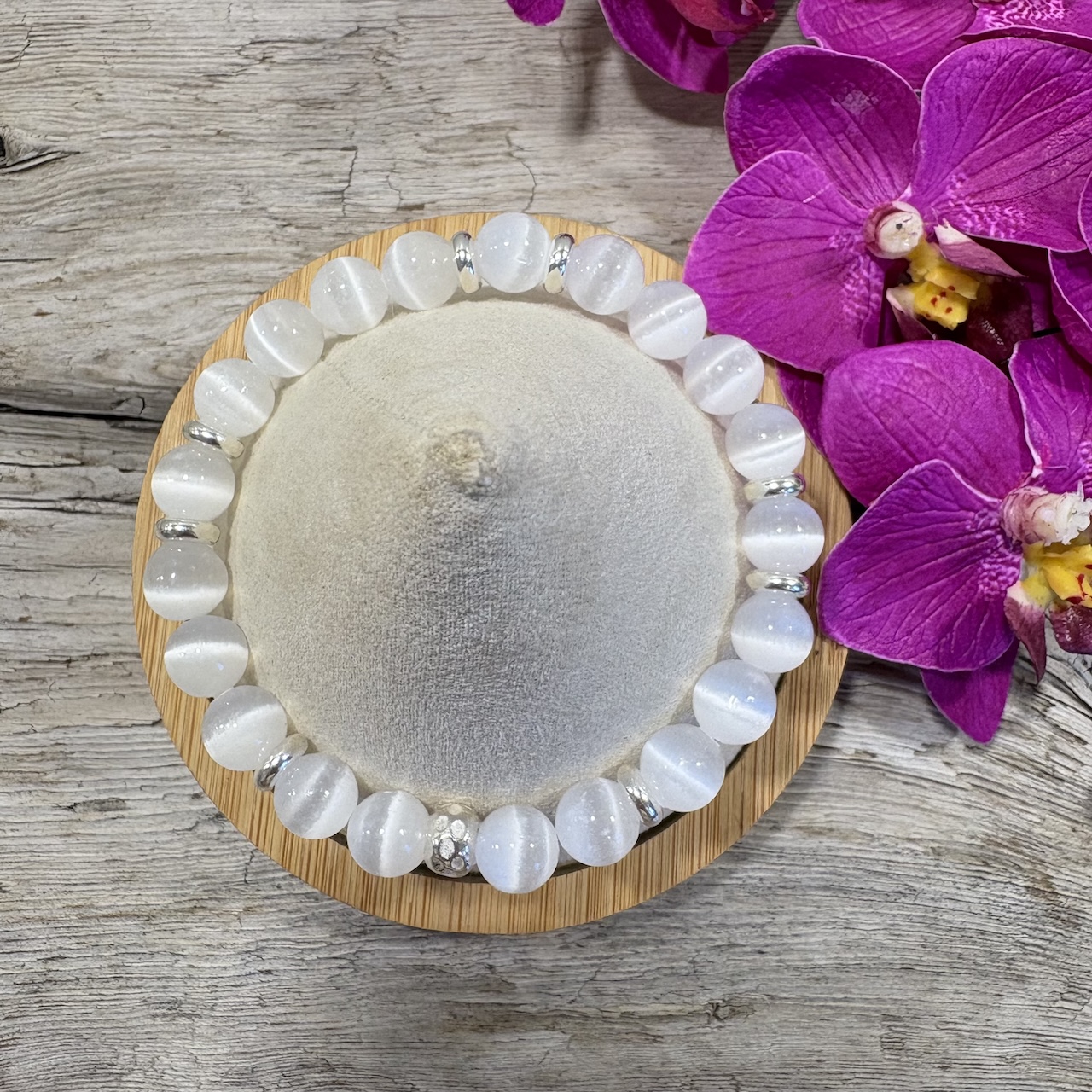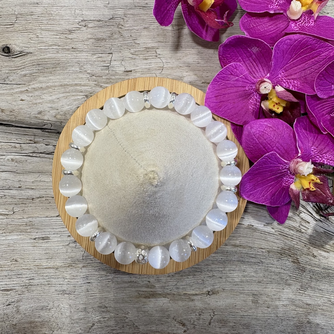Ce bracelet de Sélénite AAA de 8 mm habillera votre poignet de façon majestueuse par ses reflets. Fabriqué dans mon atelier, j’ai apporté le plus grand soin au choix de ces superbes perles de grade 3A. Le bracelet extensible est monté avec des rondelles en argent 925 . Le cachet de ce bracelet mettront en avant votre personnalité.