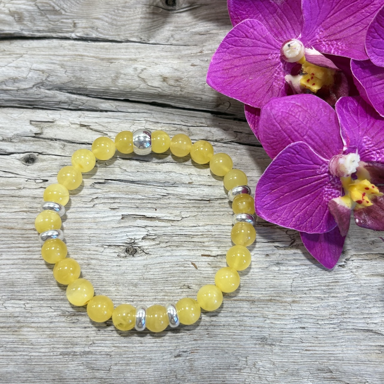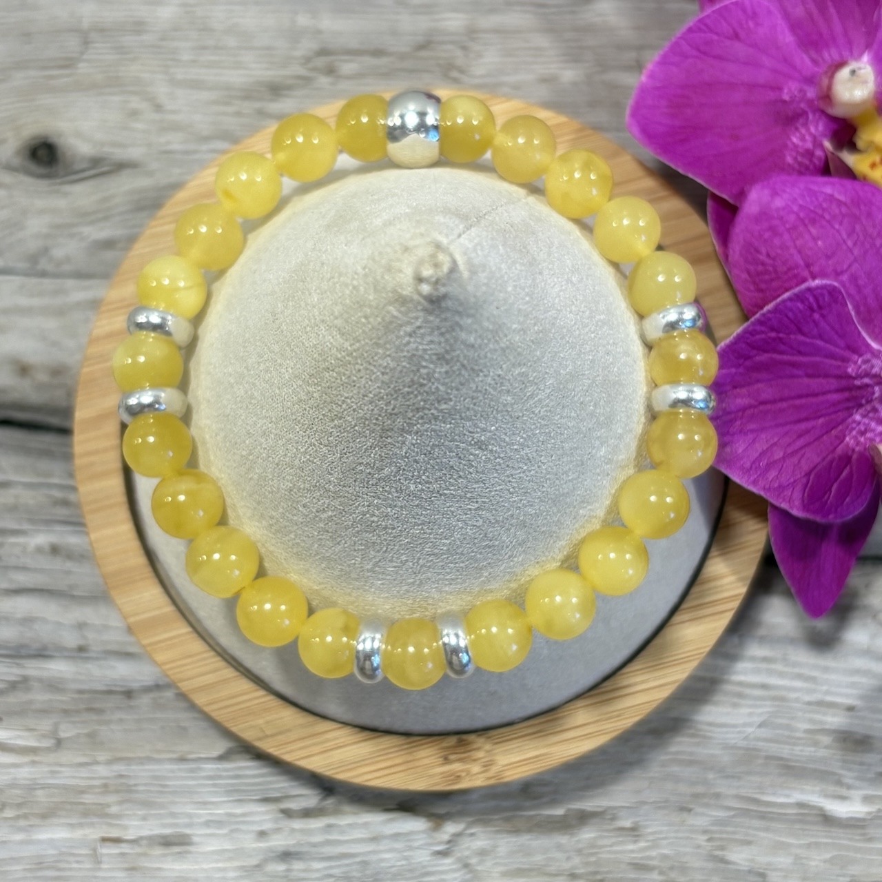 Superbe bracelet en Ambre Jaune naturel et perles en argent 925 massif. Les perles de 8mm de diamètre sont en provenance de la mer Baltique et de grade AAA. Il s’agit d’une résine organique fossilisée depuis des millénaires. La couleur douce de ce bracelet saura vous séduire et habillera votre poignet de façon très raffinée. Ce bracelet impressionnant par la légèreté de l’ambre saura se faire oublier à votre poignet.