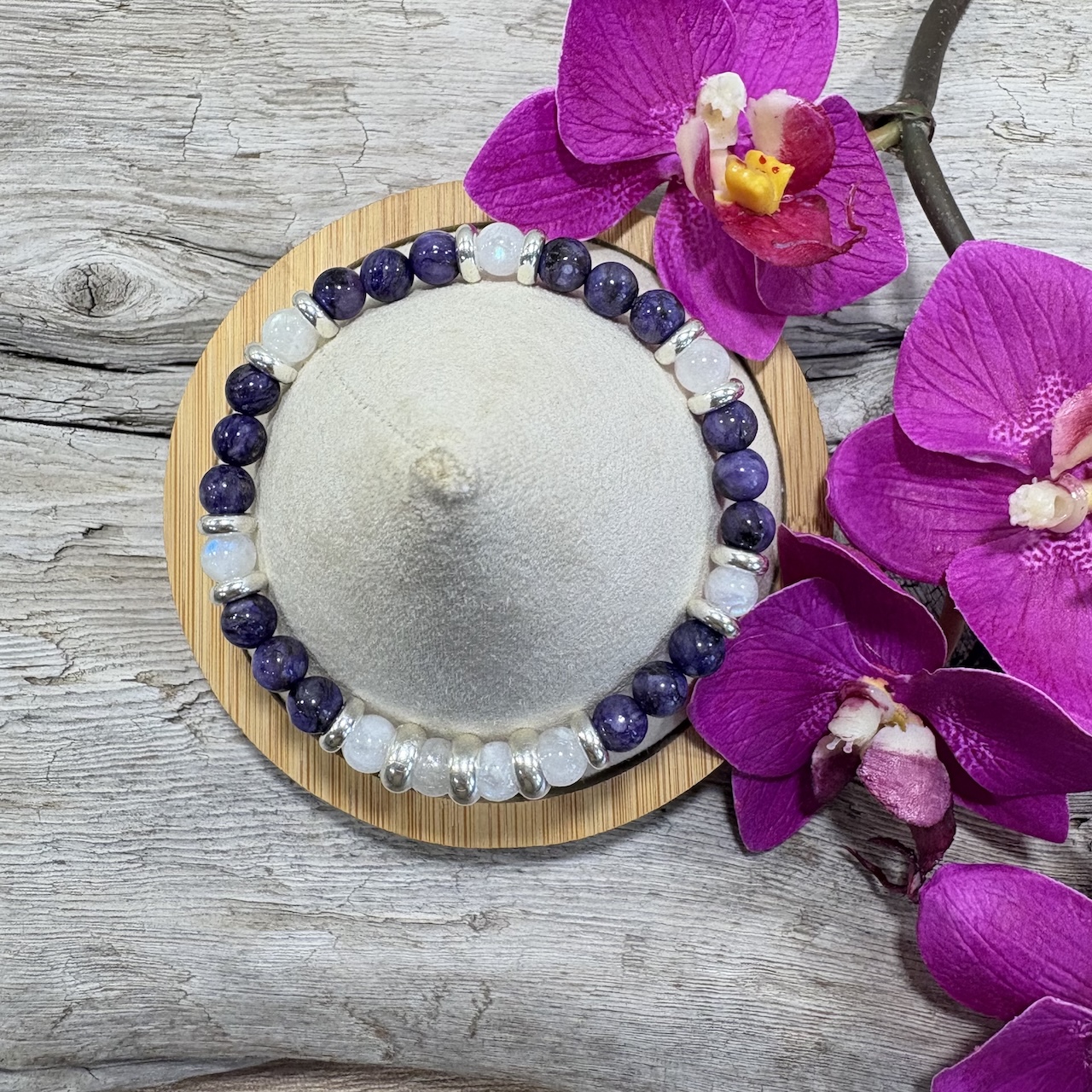 Luxueux bracelet en Charoite et Pierre de Lune arc en ciel de 6mm monté sur argent 925. Il se porte seul ou accompagné d’autres bracelets, ce bijou habillera votre poignet par la douceur et la profondeur de sa couleur. Fabriqué dans mon atelier et j’ai apporté le plus grand soin dans la sélection de ces pierres de grade AAA qui sauront vous séduire par leurs qualités et propriétés.