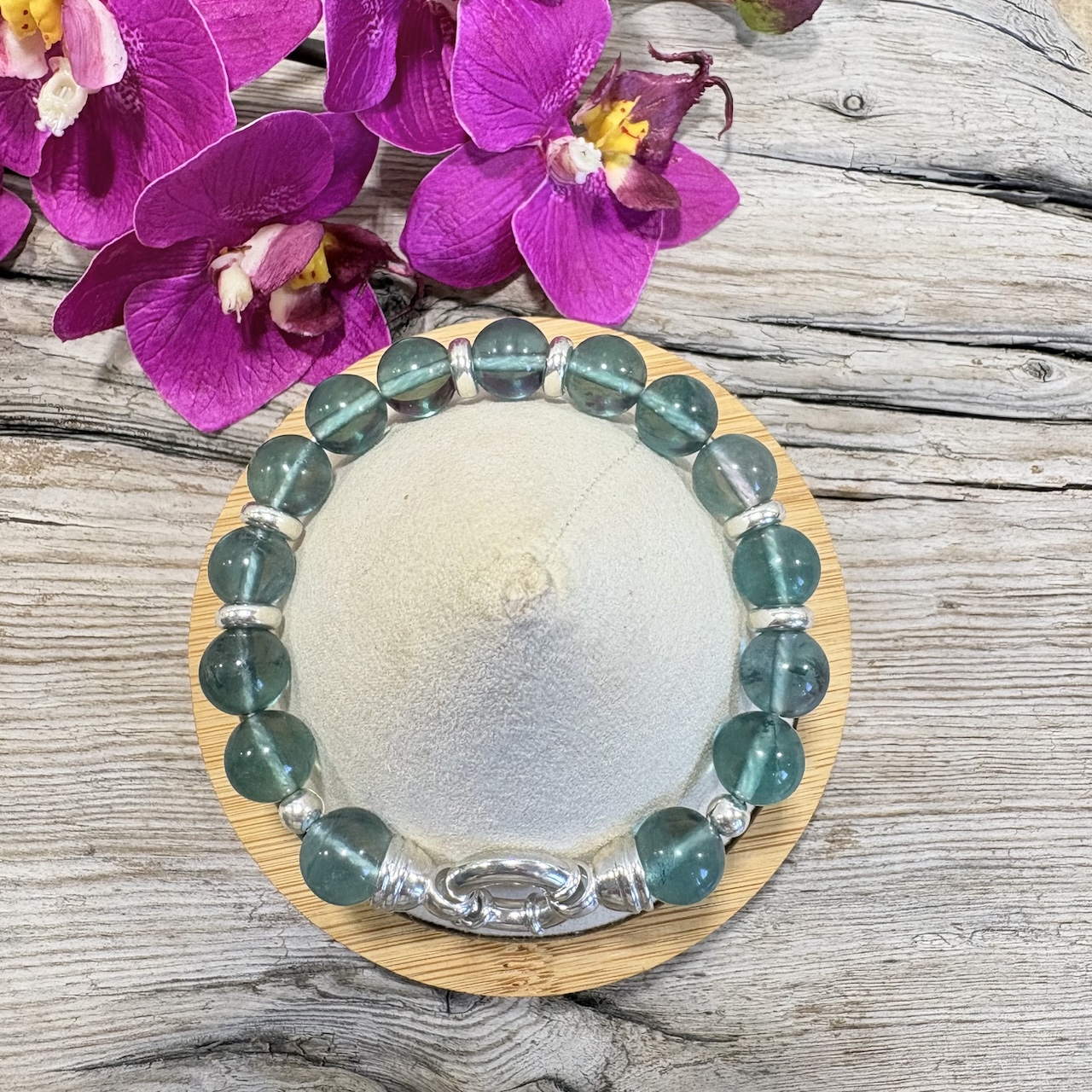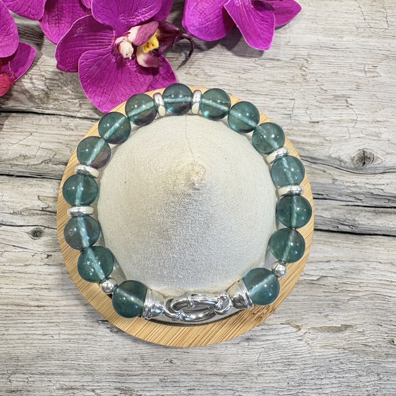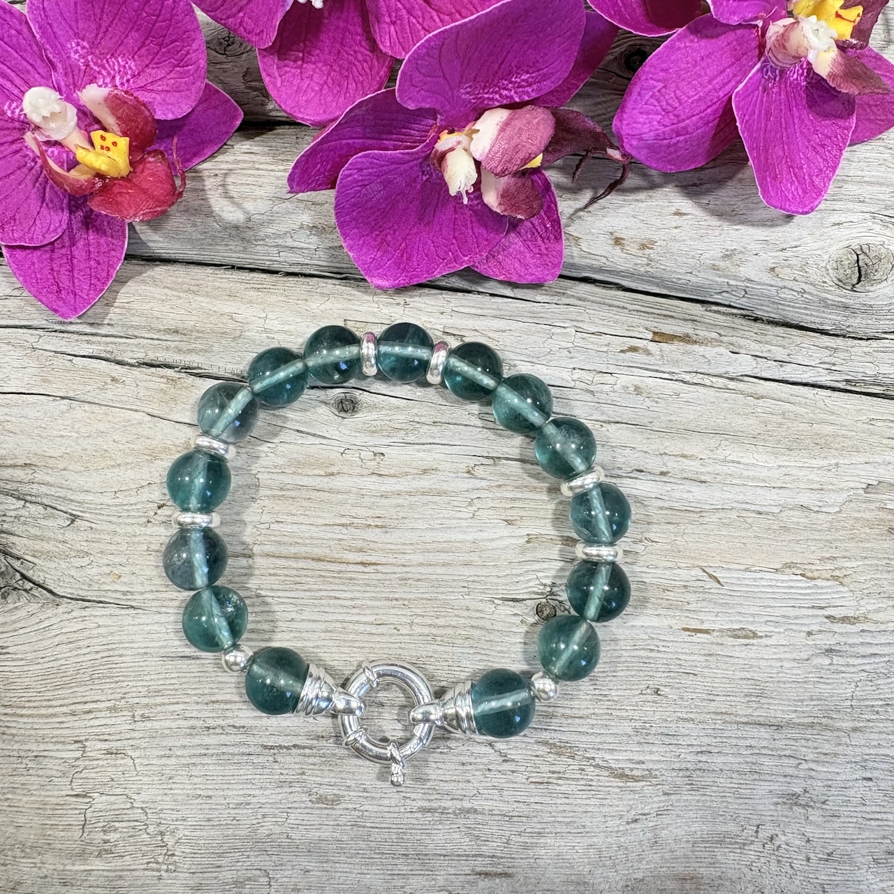 Ce bracelet de Fluorine Verte de 10mm habillera votre poignet de façon majestueuse par sa couleur vert lagon. Fabriqué dans mon atelier, j’ai apporté un grand soin au choix de ces perles qui sont de grade AAA+ avec un polissage parfait. les perles intermédiaires sont en argent massif 925 . Un magnifique fermoir « bouée » en argent 925 orne ce somptueux bracelet. Ce luxueux bracelet vous enveloppera de la magie de cette pierre magnifique qu’est la Fluorite.