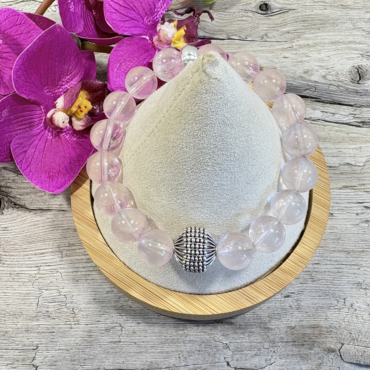 Luxueux bracelet Quartz Rose Étoilé de grade AAAA en provenance de Madagascar et de perles artisanales en argent massif 925. Les perles de Quartz Rose de 10mm sont d’une qualité exceptionnelle, très translucides avec un lustre parfait.