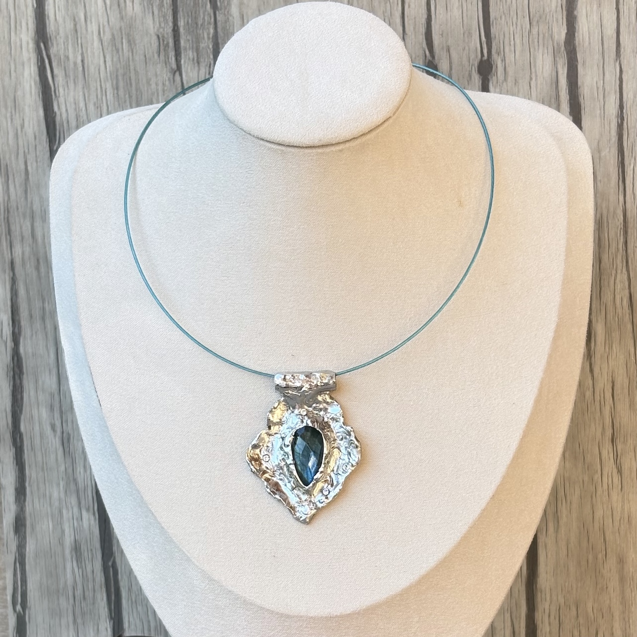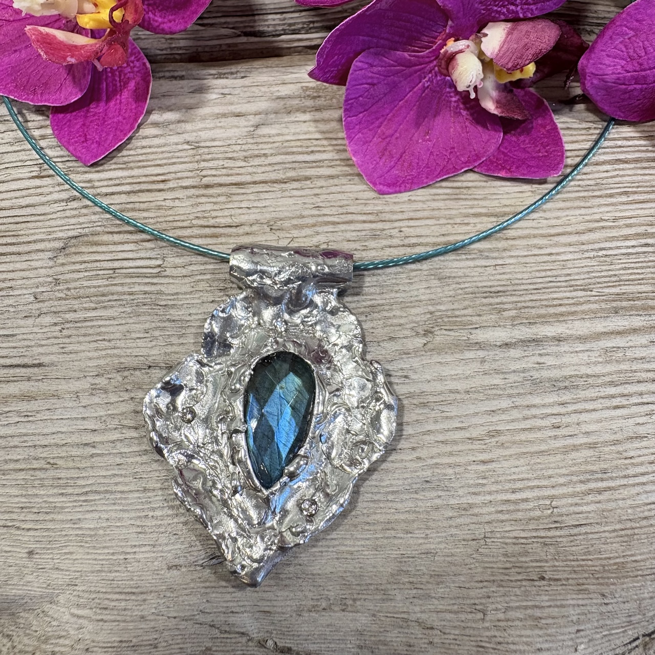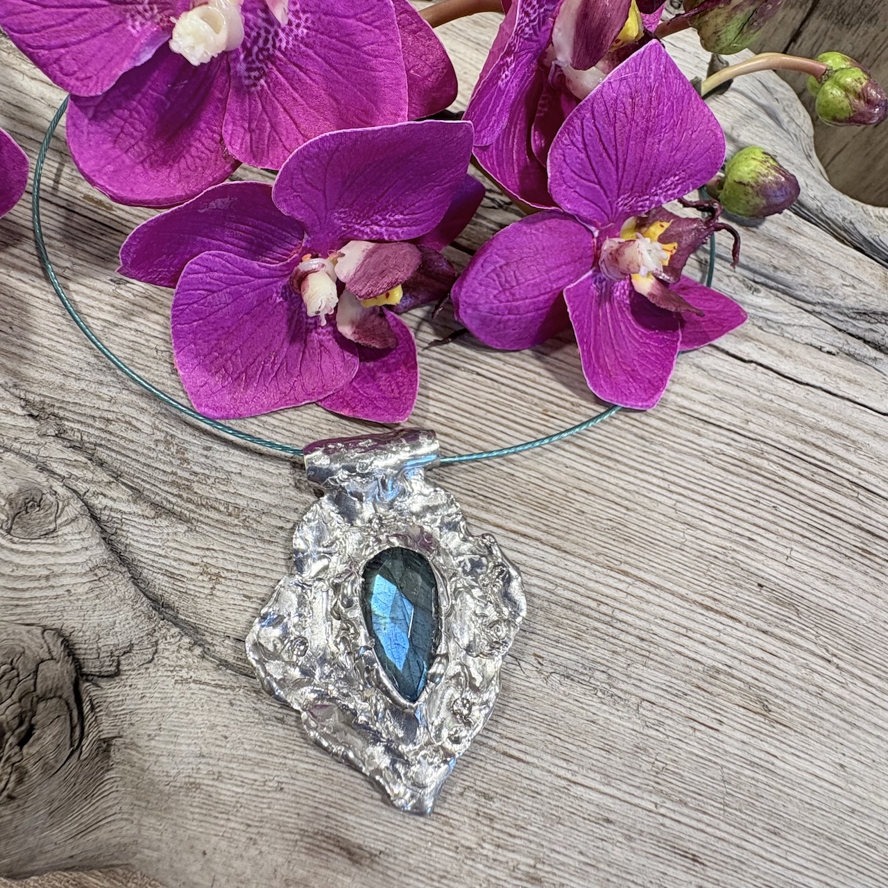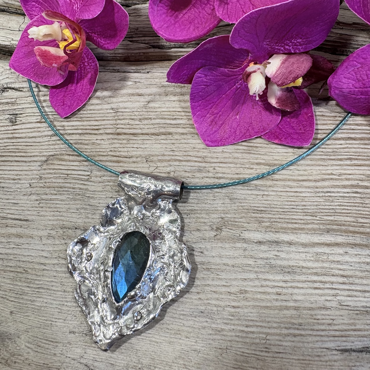 Ce collier de Labradorite habillera votre décolleté par ses reflets bleus intenses et profonds. Fabriqué dans mon atelier, j’ai apporté le plus grand soin à créer une monture exceptionnelle simple, de forme organique pour mettre en valeur la beauté de ce cabochon de Labradorite facettée. La pierre de 2 cm sur 1 cm, en provenance de Madagascar est de grade AAA. Monté à partir d’un alliage d’étain de bijoutier (garantie sans plomb) et d’argent. Cette pièce unique se porte en ras de cou.