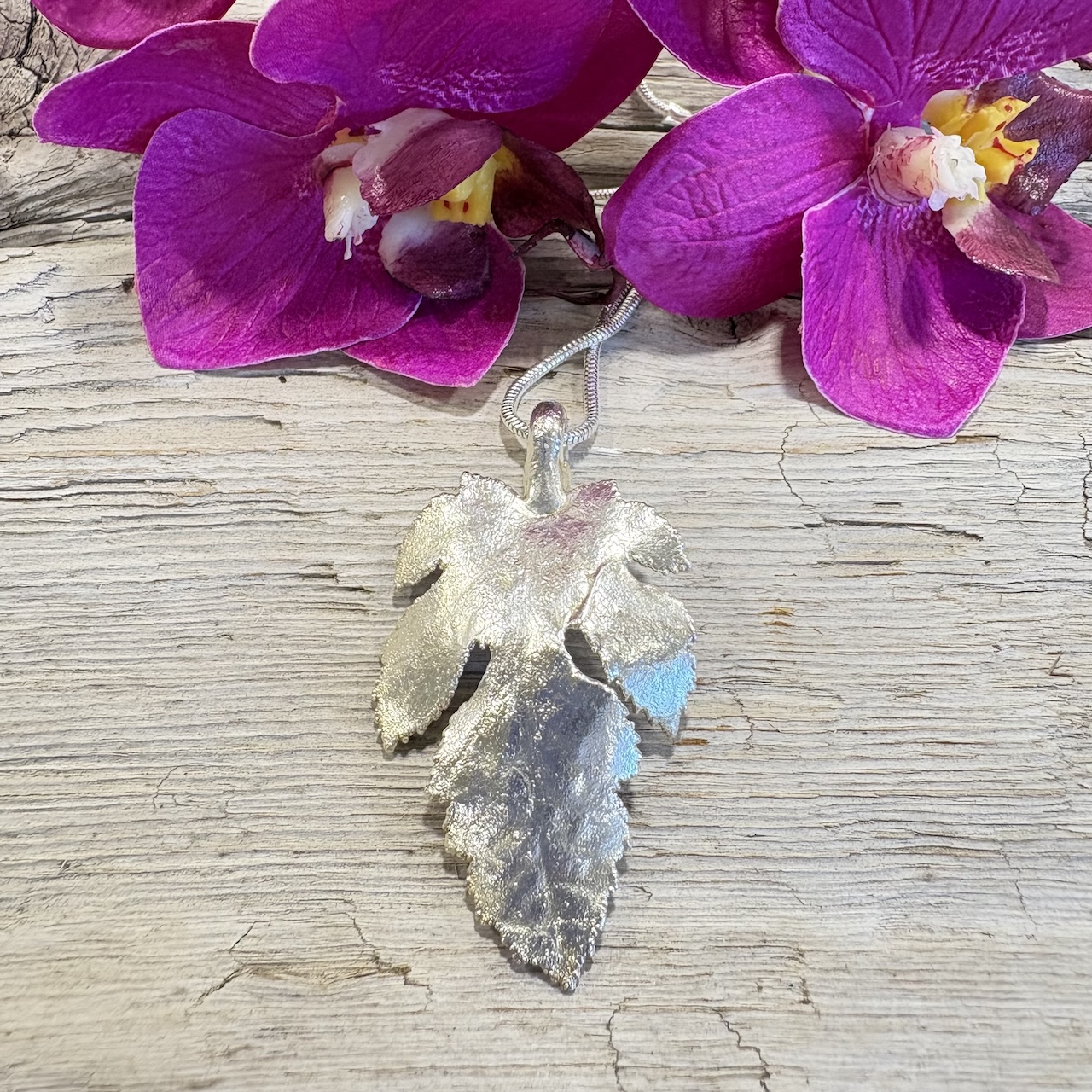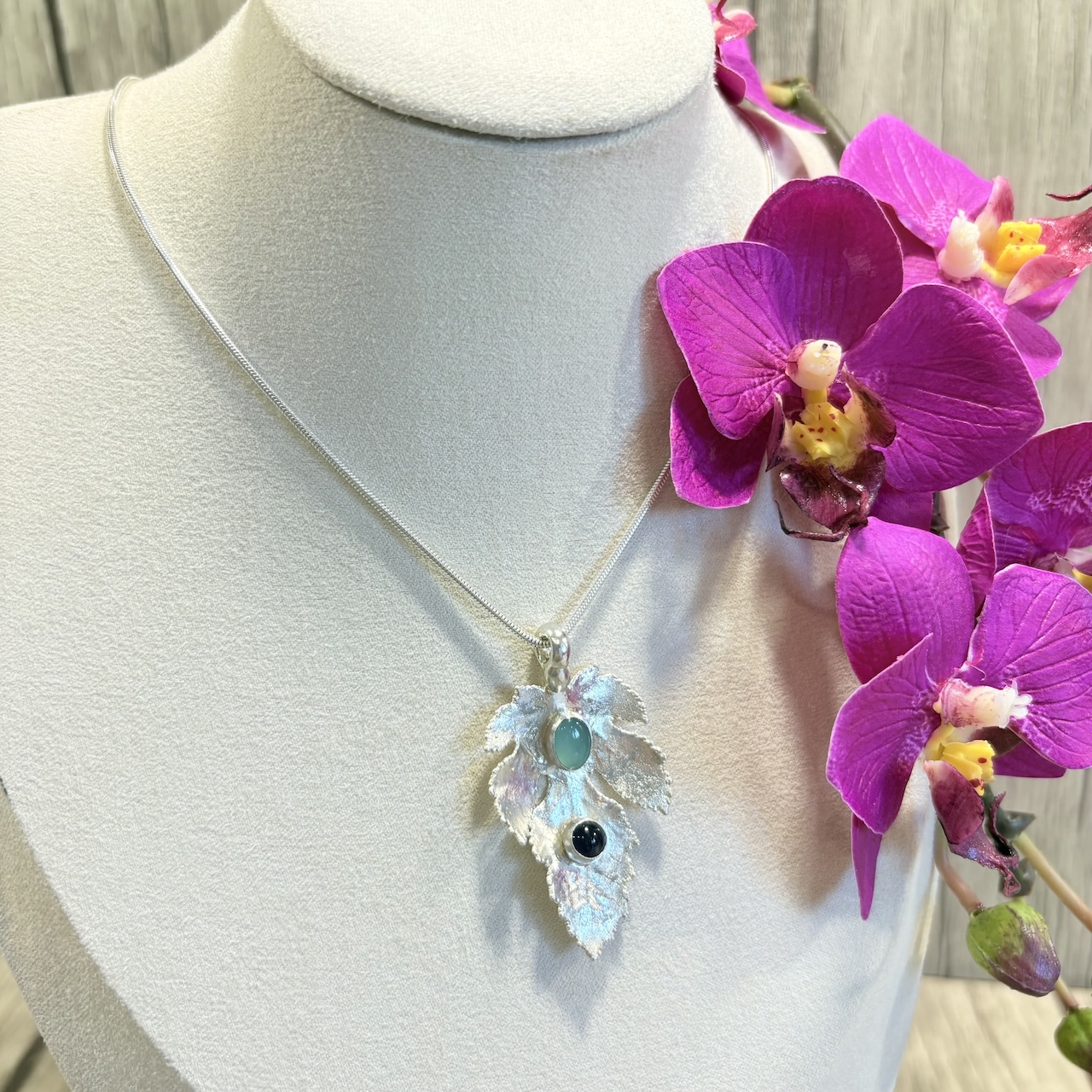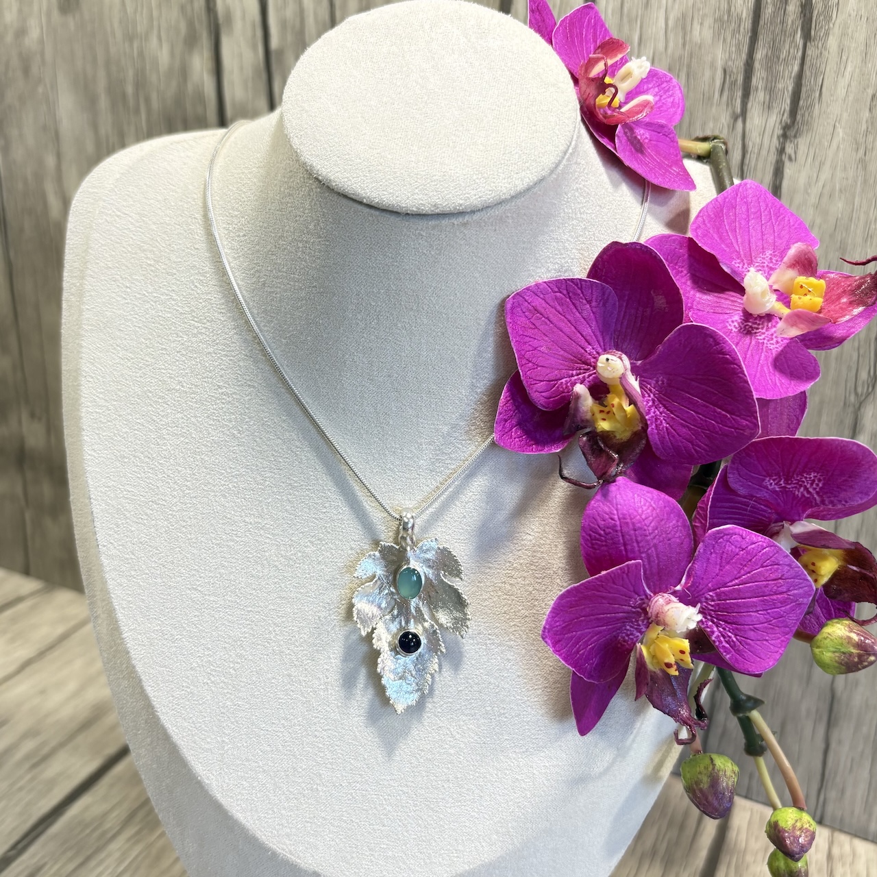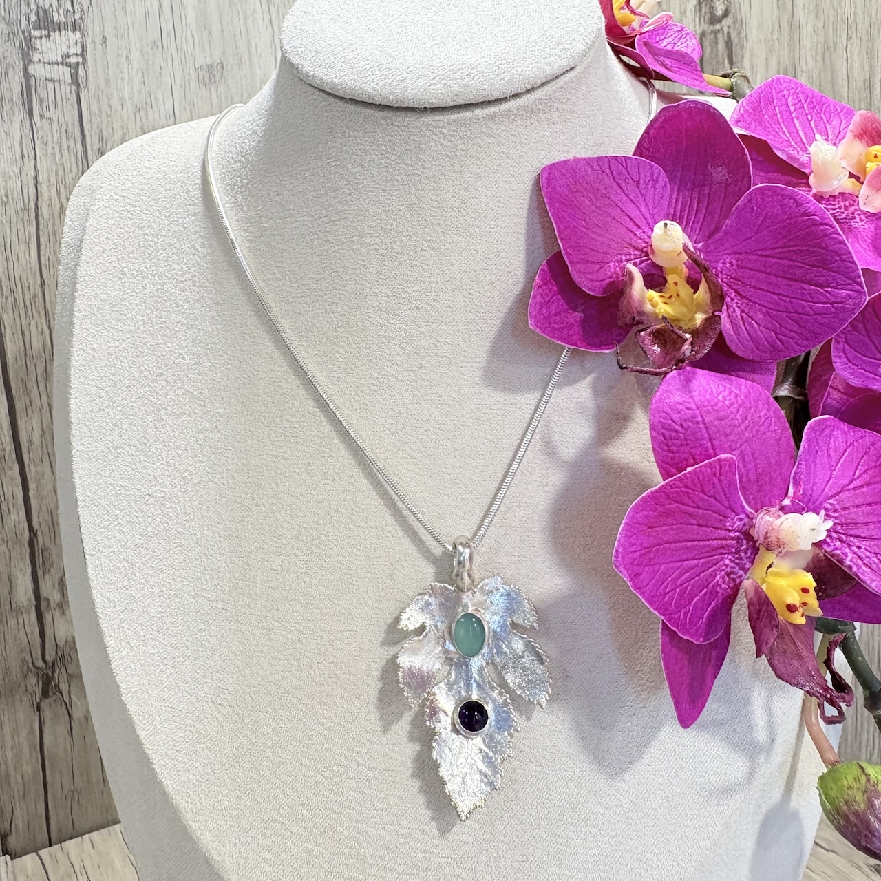Ce Collier feuille électroformée en argent avec Calcédoine et Amethyste est réalisé par mes soins. La feuille qui supporte ce pendentif est une feuille naturelle que j’ai électroformé en argent 925. Les cabochons qui ornent ce bijoux sont en Calcédoine et Améthyste, les deux sont de grade AAA en provenance de Jaipur. Pièce unique et artisanale ce collier mettra en avant votre personnalité et votre gout pour l’originalité.