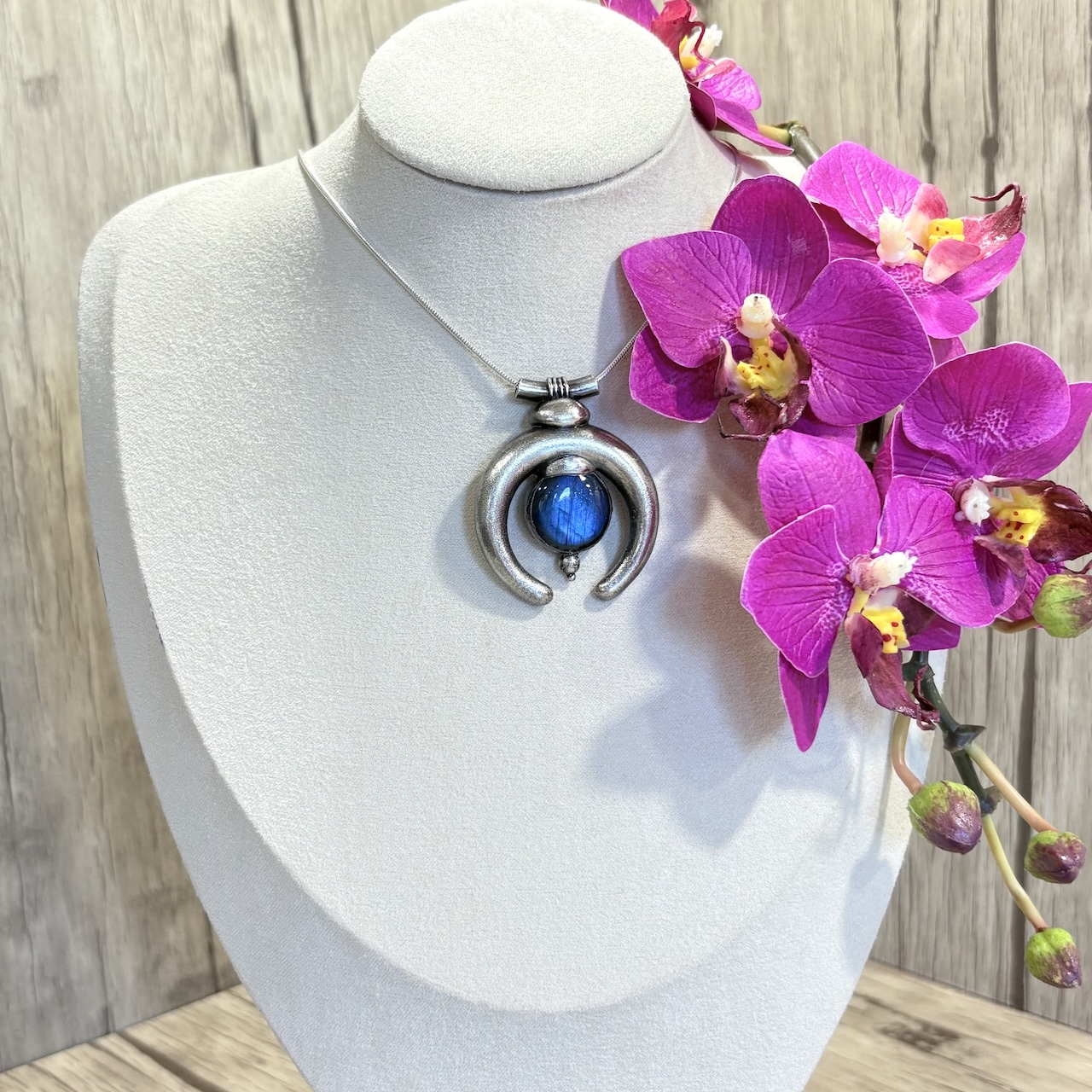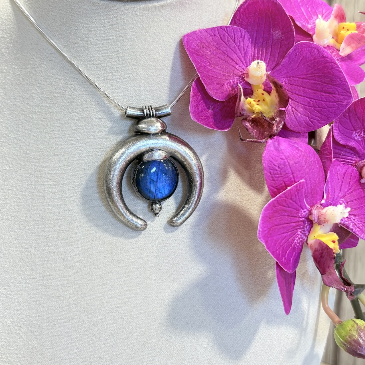 Ce superbe collier pendentif de Labradorite de grade AAA ravira votre décolleté par ses reflets bleus intenses et profonds. Réalisé artisanalement ce bijoux marquera par son originalité. Electoformé en argent 925 et patiné ce pendentif ne manquera pas d’attirer l’attention.
