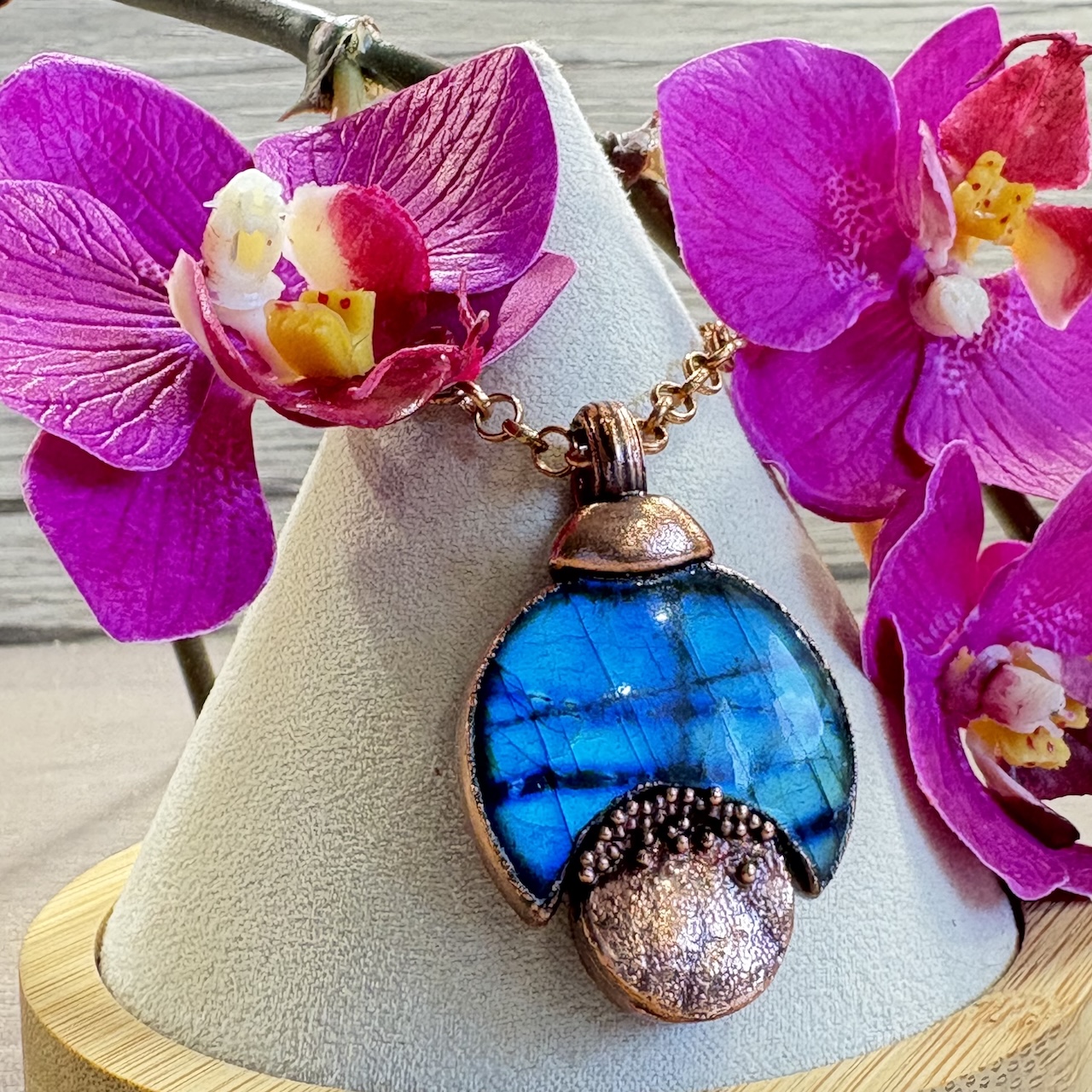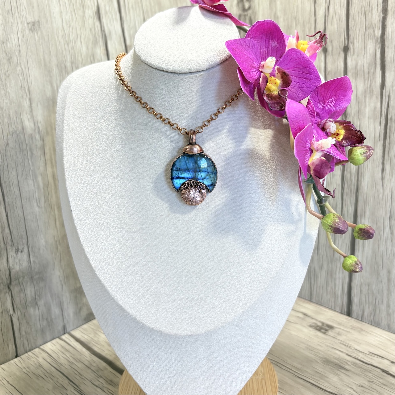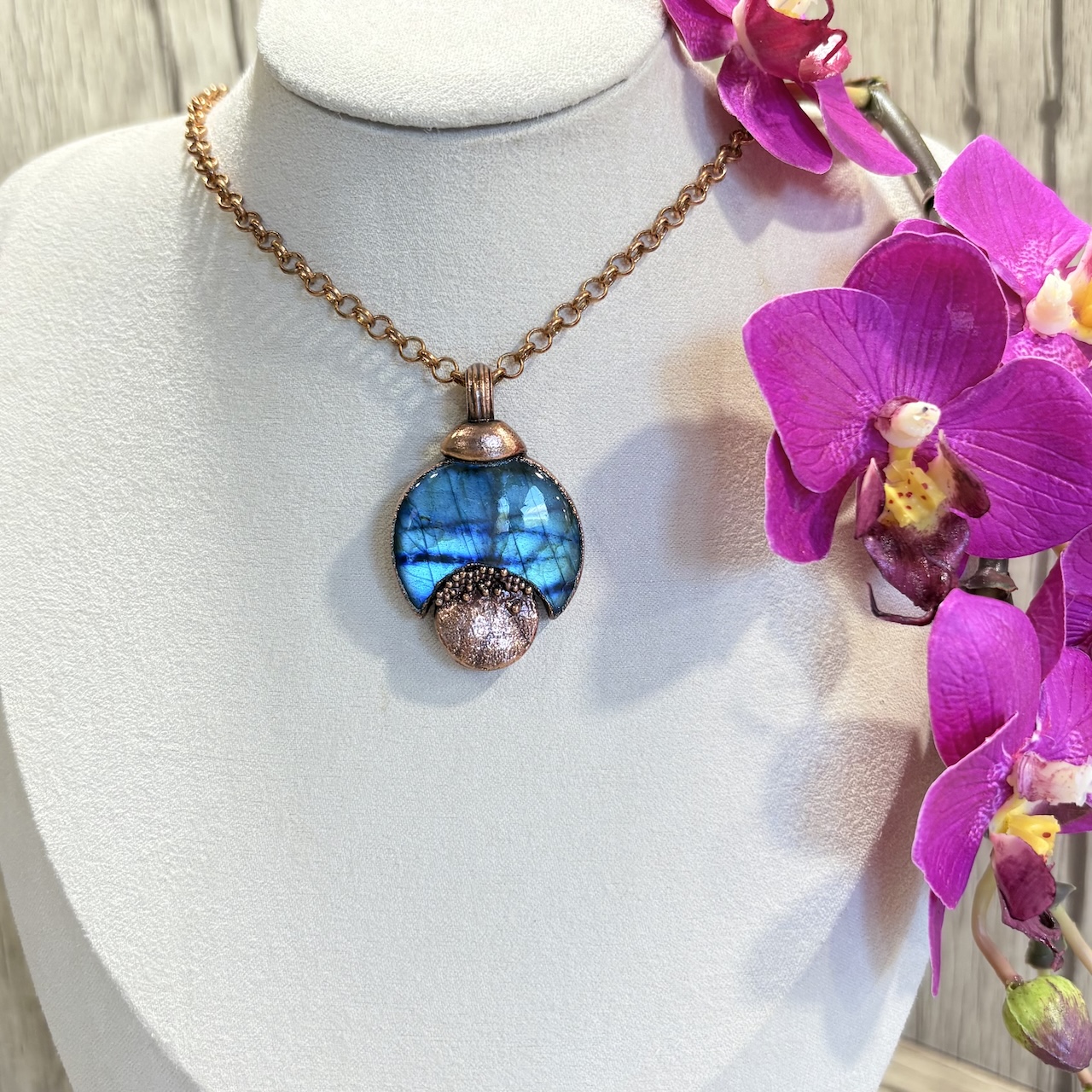Ce superbe collier pendentif Lune de Labradorite de grade AAA ravira votre décolleté par ses reflets bleus intenses et profonds. J’ai confectionné la monture en cuivre de ce pendentif en intégrant un cabochon lune de Labradorite. Cette pièce unique se porte en ras de cou la chaine en cuivre mesure 42 cm. Le cuivre est traité pour éviter l’oxydation naturelle de ce métal.
